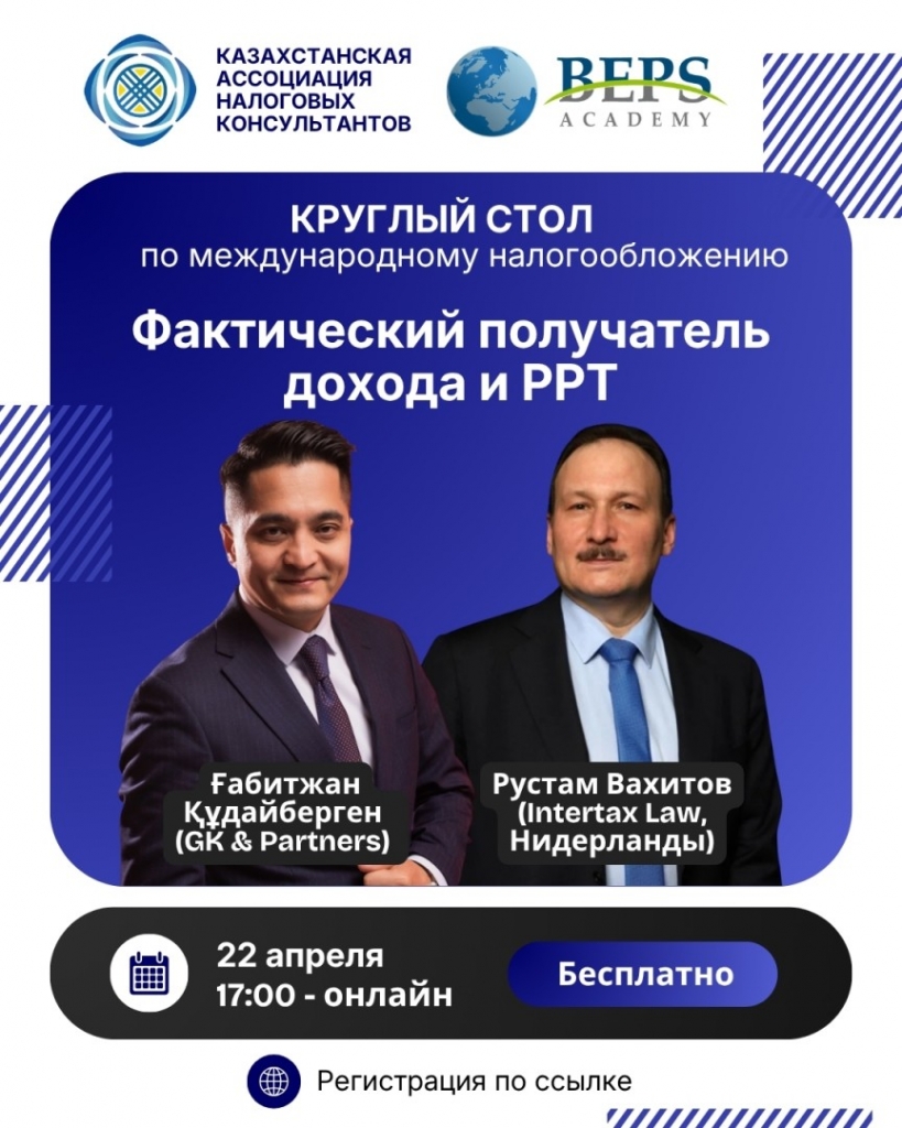 22 апреля в 17:00 (по времени Астаны) онлайн, Казахстанская ассоциация налоговых консультантов совместно с Academy BEPS проведет круглый стол по международному налогообложению.